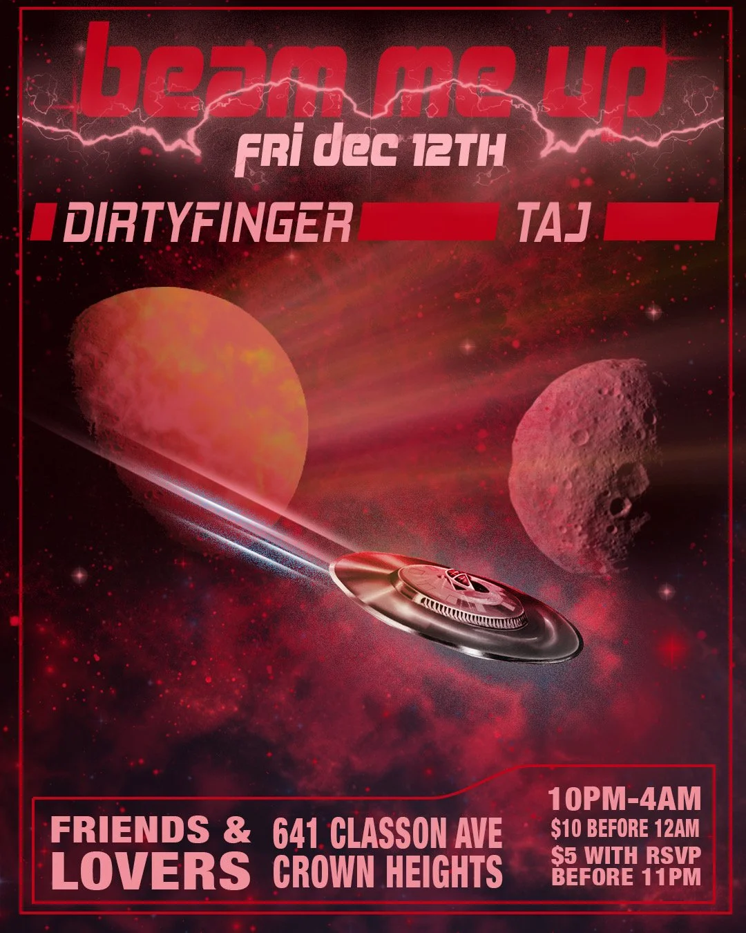Join us for for “Beam me up” Friday December 12th as Friends and Lovers mainstays, Dirtyfinger and Taj join forces to bring you a night of eclectic dance music from all corners of the galaxy.