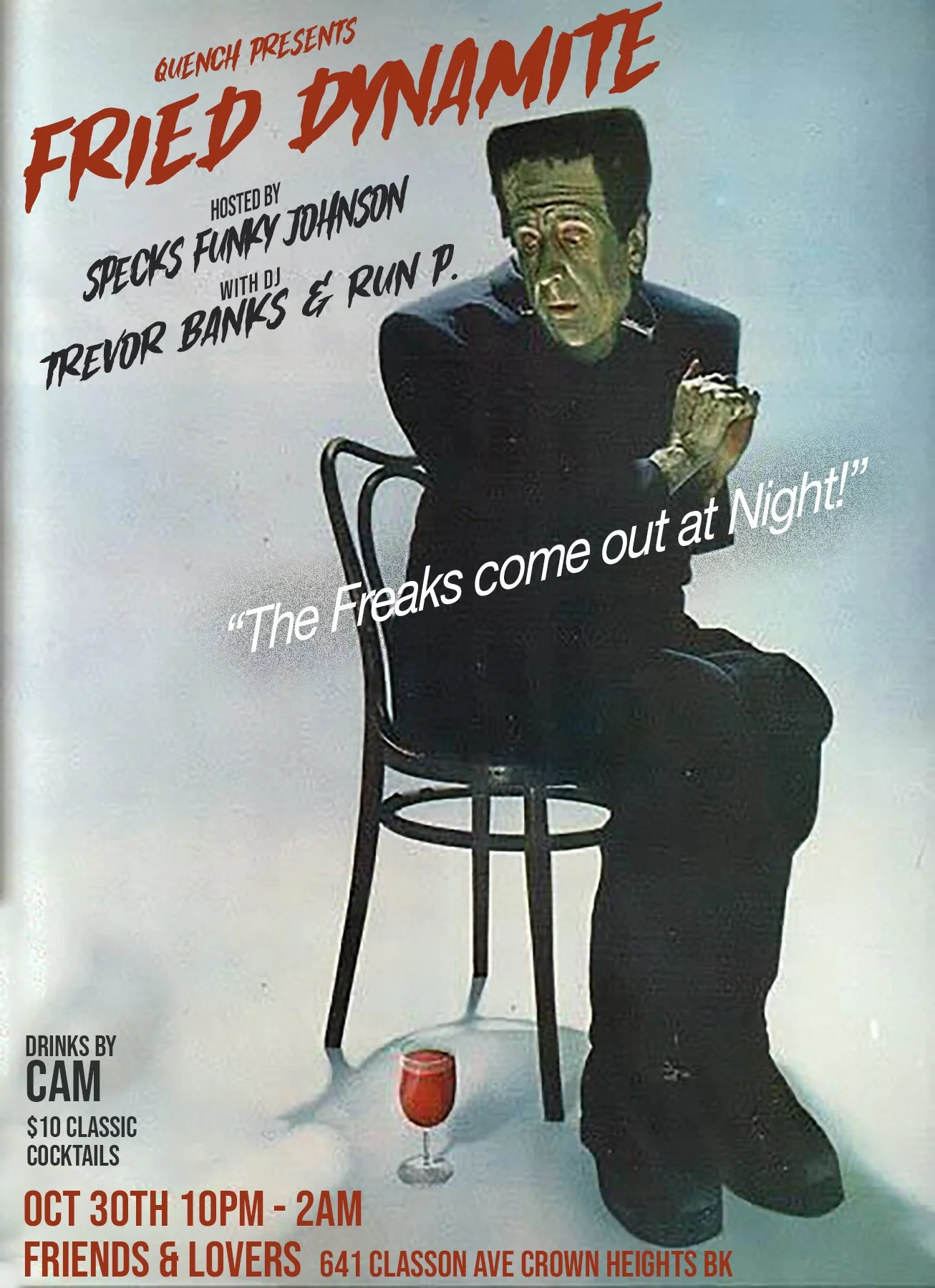 Ease on down the road to Fried Dynamite for a Fright Night that’s outta sight night and overflowing with peace, love, and hair grease. Cut a rug while we hold you down on the dancefloor until 2AM with the latest and greatest Rare Groove, Soul, Funk, Disco, Hip-Hop, and more with Blacktastic MC, Specks “Funky” Johnson, alongside resident DJs Trevor Banks and Run P.