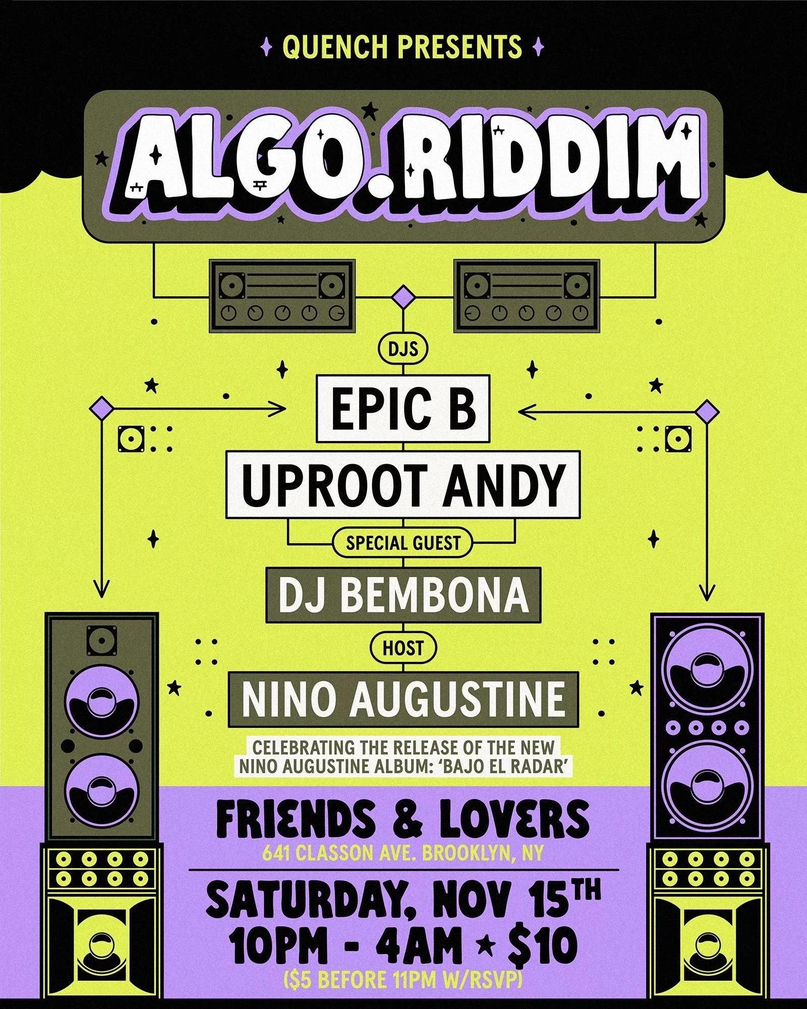 Come Bussa wine for Algo.Riddim powered by QUENCH in Crown Heights, BK as we ride for the people with Epic B and Uproot Andy two certified NY staples on the Latin and Dancehall scenes. They’ll be bringing all the smoke alongside special guests Nino Augustine and Bembona to serve up EXTRA large portions of West Indian, Afro-Latin, and African flavors from start to finish.