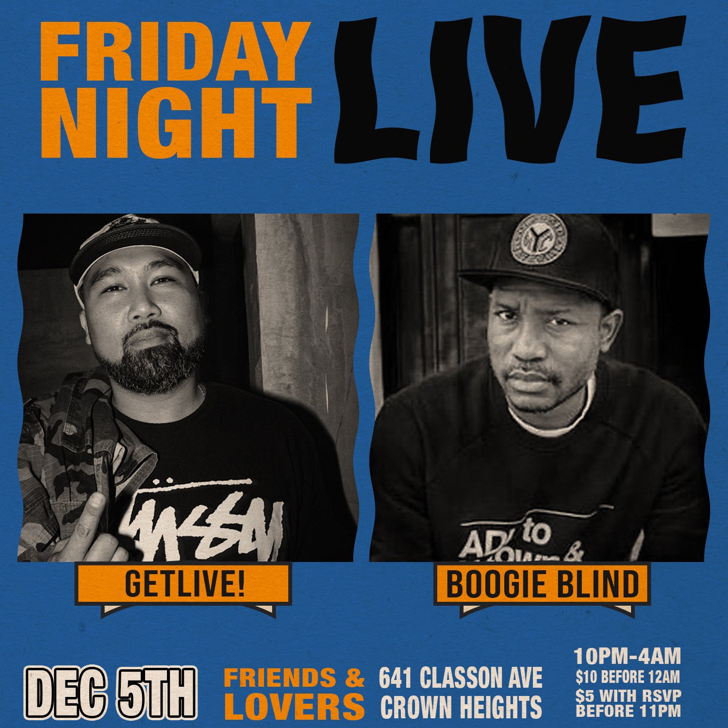 Friday Night is all the way LIVE at FnL December 5th from 10PM until late as Getlive! shakes the room alongside Boogie Blind, playing classics cuts spanning Hip-Hop, Dancehall, Disco, Funk, Soul and more!