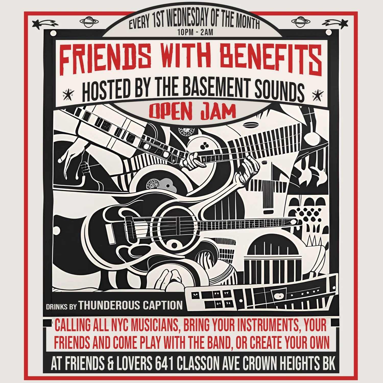 Attention musicians far and wide! The time has come for us ALL to have some fun on stage with likeminded individuals in the name of Friends With Benefits an open jam session for instrumentalists, music enthusiasts, and overall good people at Friends and Lovers starting at 8PM. Whether you play the drums, guitar, bass, or horns we got a place for you front and center at 641 Classon Ave.