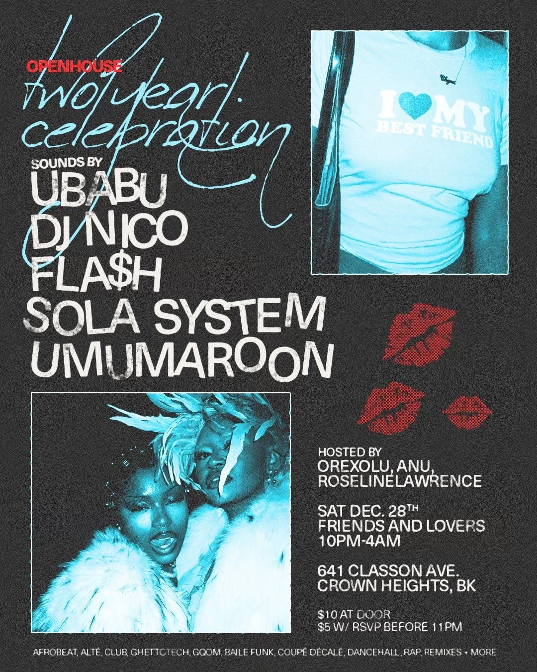 OPENHOUSE is a monthly dance party that celebrates the vibrant sounds of the African diaspora. From afrobeat and alte to club, ghettotech, rap, baile funk and dancehall, this event is a sonic journey through both modern hits and nostalgic classics, curated for Black, queer, African creatives who are in search for more of a alternative scene. It's a space to vibe, dance, and connect with the music we grew up on, reimagined for today’s generation.