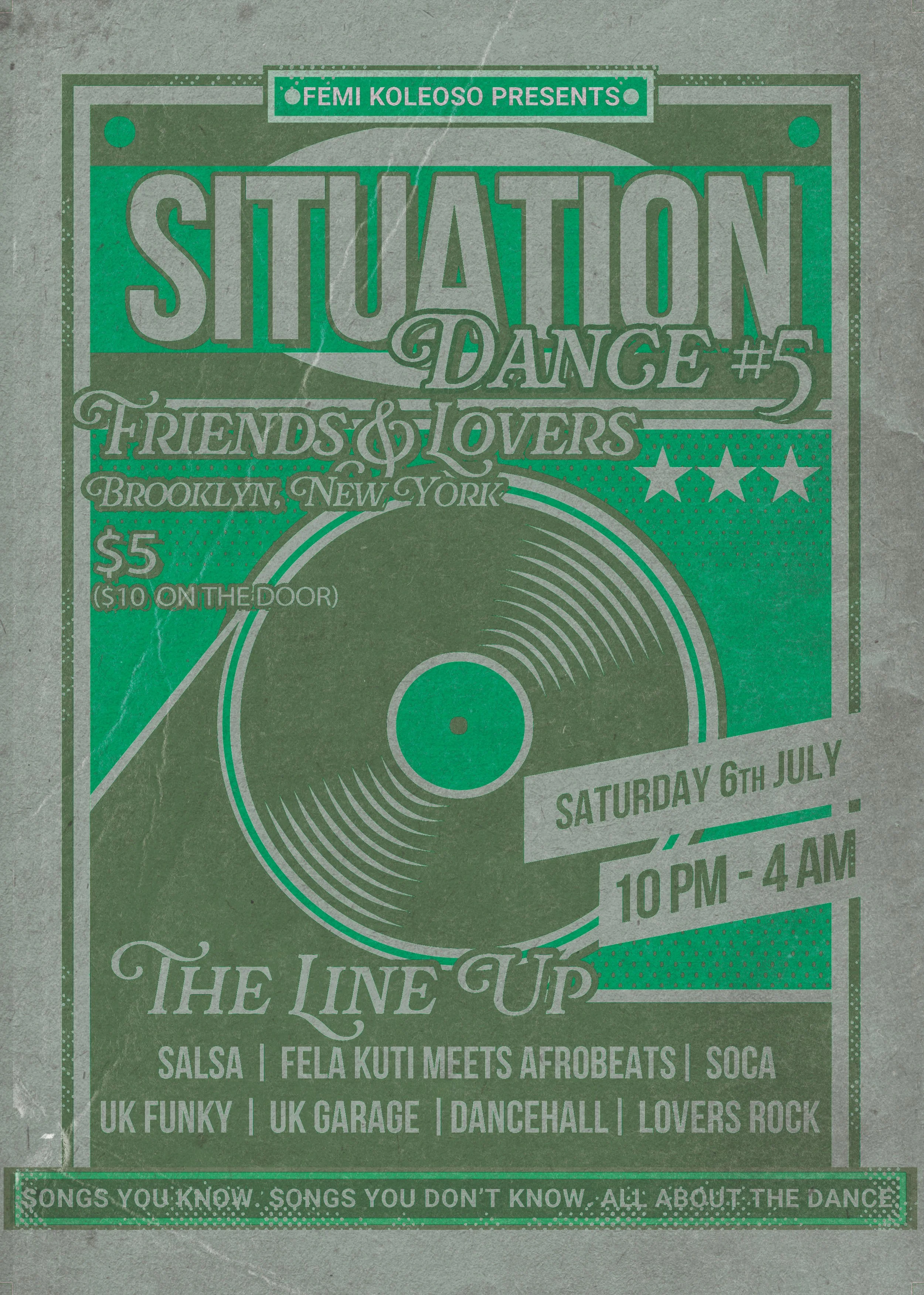 A night centered around the dance established by Femi Koleoso (Gorillaz, Ezra Collective), Situation Dance #5, makes its US debut in Crown Heights, Brooklyn at Friends and Lovers in the company NYC mainstay and London representative, Khalil (Shapes + Back to Life).