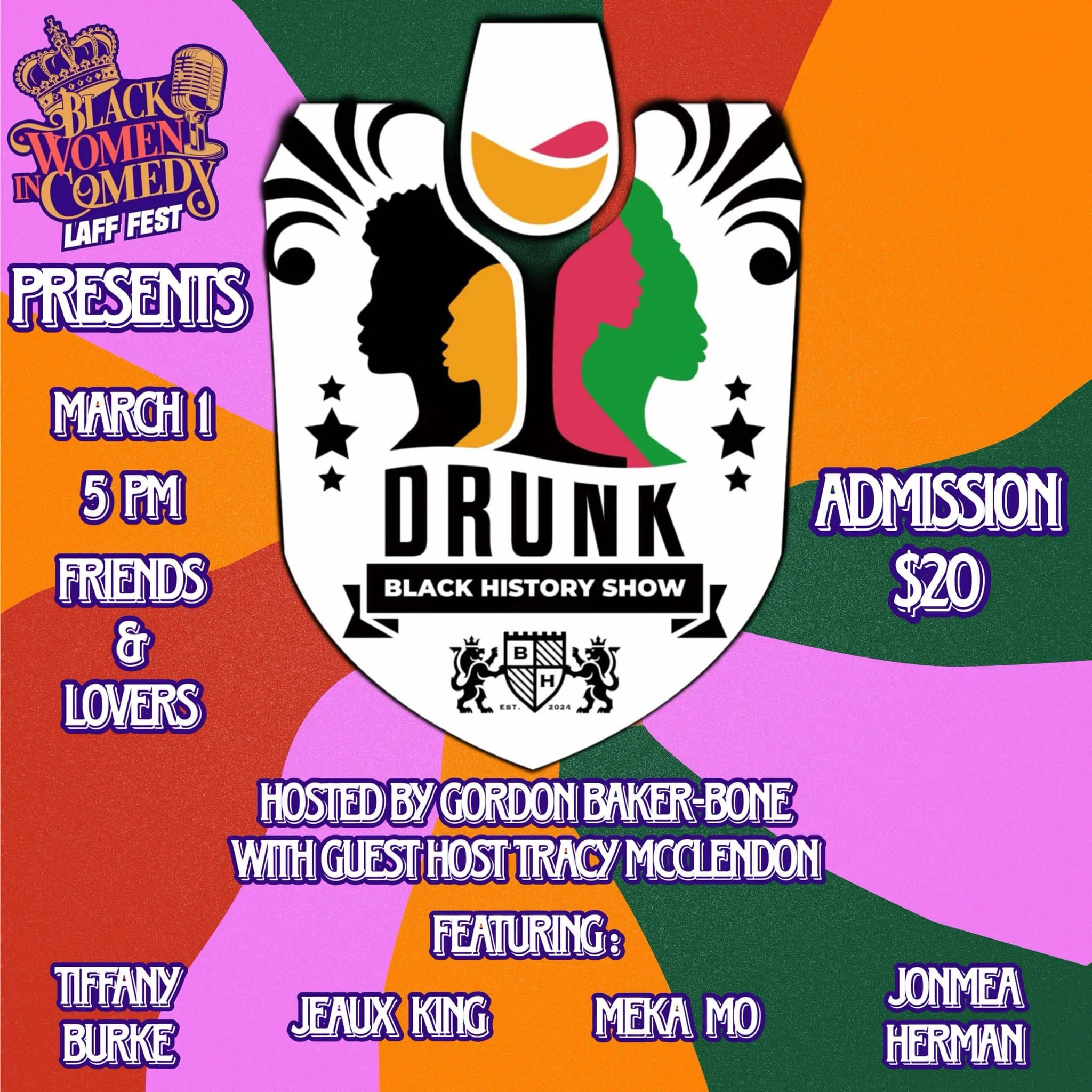 Get ready to sip and celebrate Black culture with the Drunk Black History Show, where host Gordon Baker-Bone takes you on a wild ride through the untold stories of iconic Black figures—served with a splash of humor and a twist of fun! In partnership with the Black Women in Comedy Festival, this show is a comedic cocktail featuring the fabulous talents of Tiffany Burke , Jeaux King, Jonnea Herman , and Meka Mo with Tracy McClendon as our special guest host. It's a night of laughter, legacy, and libations that you won't want to miss!